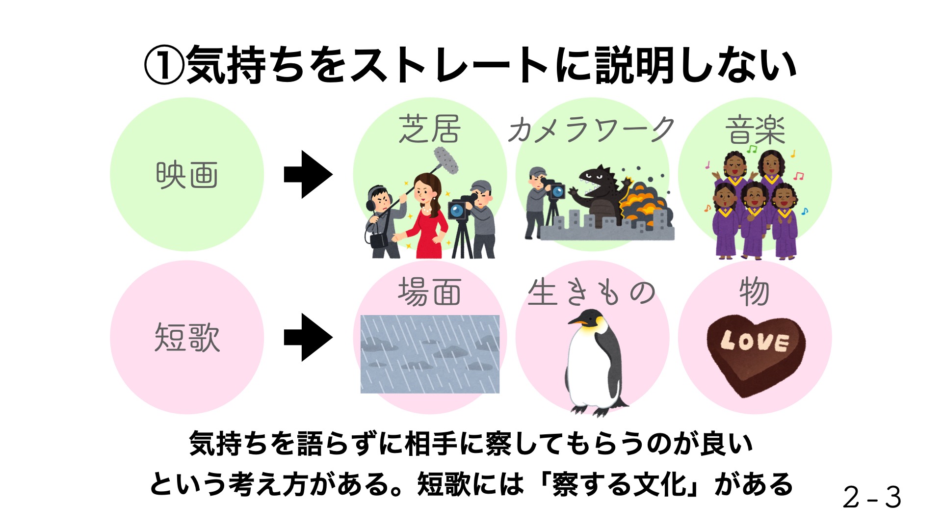 では、短歌はどうか。じつは短歌にも話をストレートに伝えずに、見せる工夫があります。「悲しい」「好きだ」という言葉を使わずに、その気持ちを伝える。たとえば、雨が降っている場面の話を詠むことで、「悲しい」気持ちを伝えるというようなことです。人は短歌を読んで、微妙な意味を読みとります。これは、察するということに近いです。「短歌には察する文化がある」と言ってもいいかもしれません。